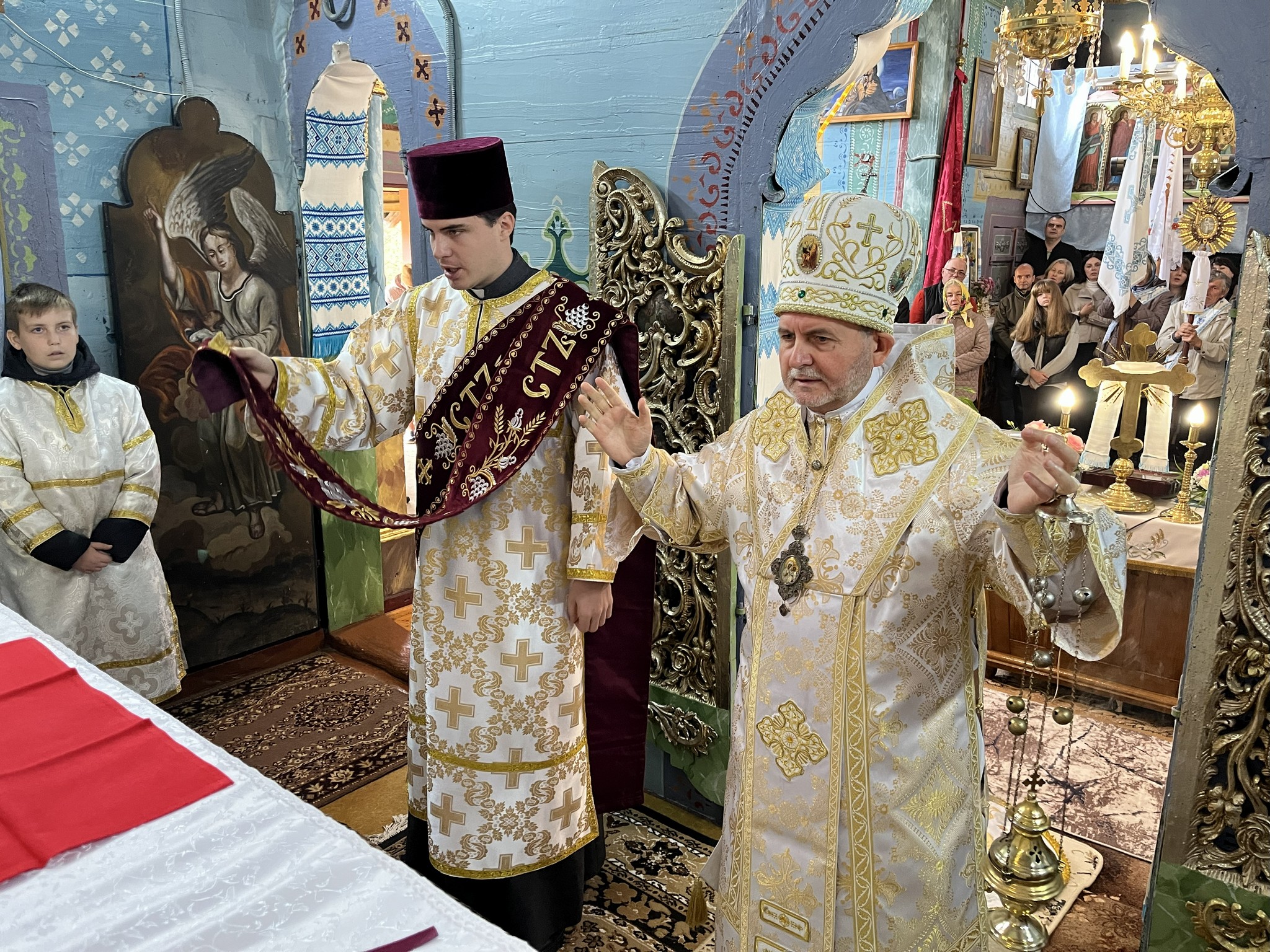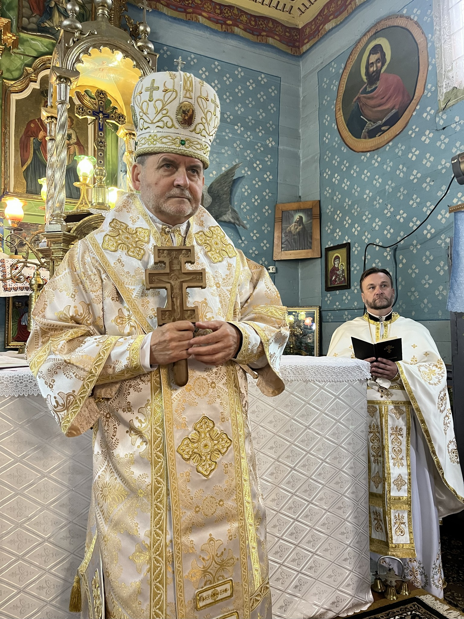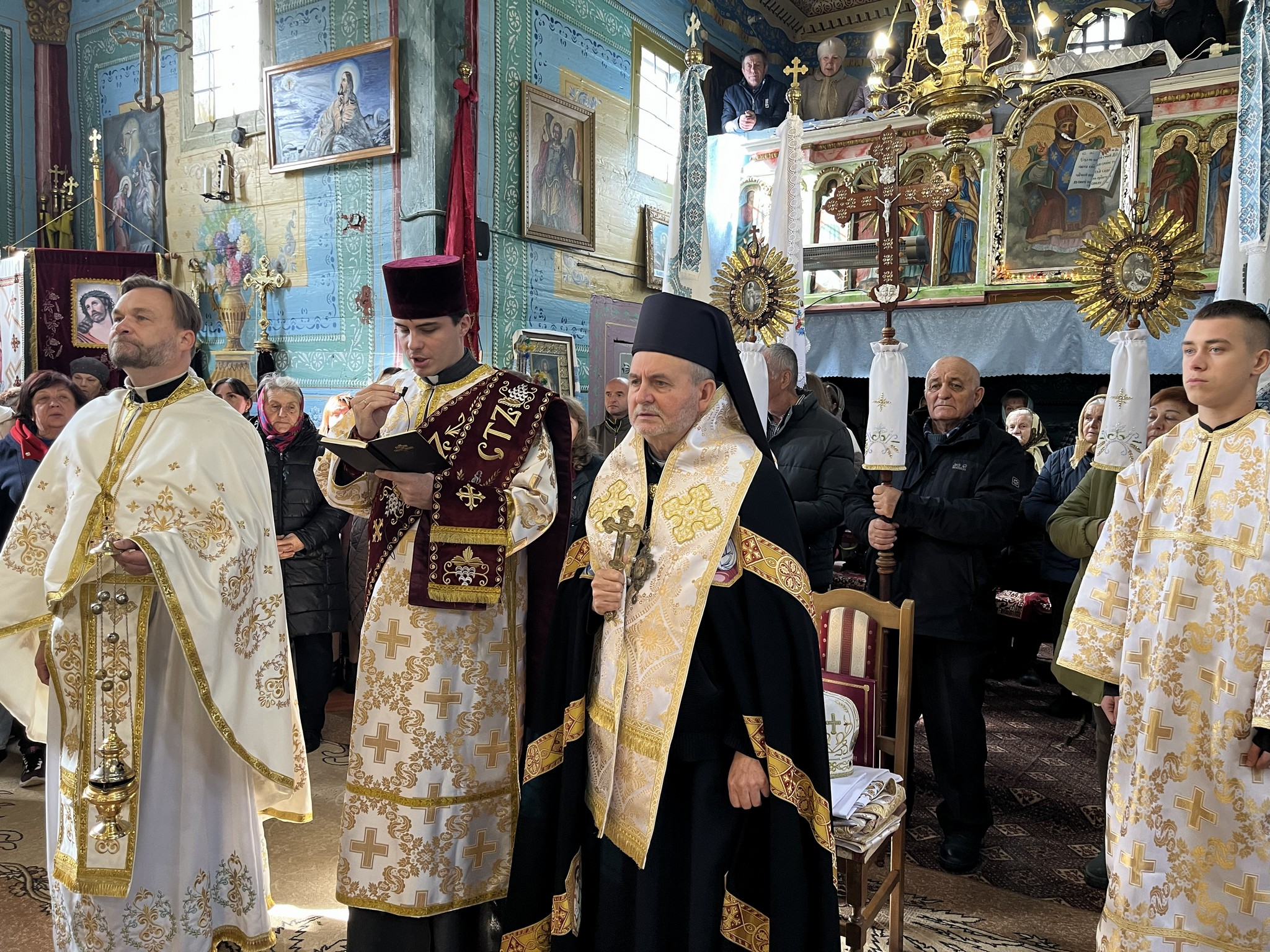 Після урочистої зустрічі архиєрея розпочалася велична архиєрейська Божественна Літургія за участі багатьох вірних та місцевого духовенства. У старовинні дерев’яній церкві Воздвиження Чесного Хреста Господнього лунали щирі прохання до Бога про закінчення війни та здоров’я для всіх військовослужбовців та волонтерів.