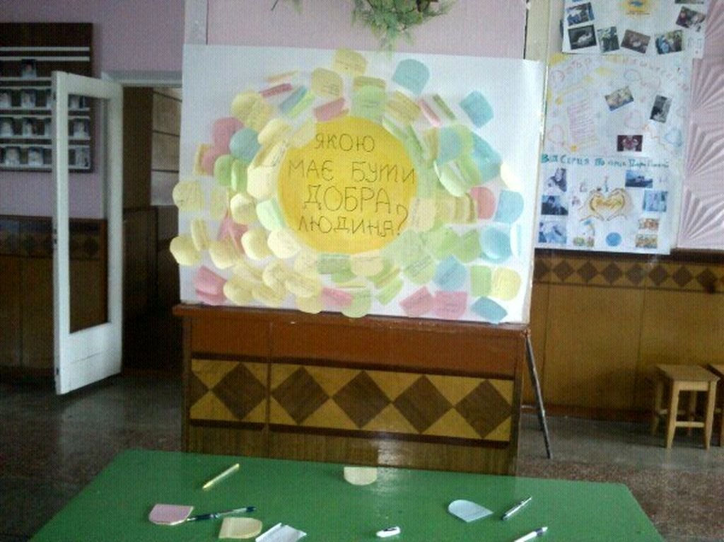 В цей тиждень було заплановано і проведено цілий ряд заходів і розпочинався тиждень святковою лінійкою, на якій учениці 8-Б класу Ворончак Віта і Інна талановито виконали пісню Наталії Май «А я бажаю вам добра». Класними керівниками з 1 по 11 класи було проведено виховні години по класах на теми добра і милосердя. Учні молодших класів малювали малюнки про добро, а старшокласники виготовляли кулажі з фотографіями на яких зображені прояви доброти. Практичний психолог разом із соціальним педагогом провели психологічно – виховний захід на тему: «Людина починається з добра!», у якому брали участь учні 8-А та 8-Б класів та на якому також переглядали короткометражний фільм «Доторкнись і побач». Цей фільм – це зайвий доказ того, що гарні та добрі люди в цьому світі ще не перевелись, переглядаючи його, ніхто не залишився байдужим. Після фільму священик от. Петро проводив духовну розмову із учнями. А у день доброти – 13 листопада, учні школи роздавали по місту людям «Листівки доброти», найприємнішим було те, що ніхто не залишився байдужим, у відповідь отримували щирі посмішки, що було маленьким проявом доброти людських сердець. Також у школі було організовано благодійну ярмарку, де учні продавали солодощі і домашню випічку, а вилучені кошти пішли на добру справу, для лікування дитини з нашого міста Кушли Максима. А ще цілий тиждень учнями проводився збір речей особистої гігієни і канцелярське приладдя для дітей, які знаходяться в інтернаті смт. Мельниця – Подільська Тернопільської обл. А в підсумку проводилося опитування – якою має бути добра людина, свої відповіді учні писали на клейких стікерах і розміщували на плакаті, утворюючи гарну, різнобарвну квітку із відповідей, і дружньо розфарбовували фарбами кольорові долоні рук і ставили відбитки долонь на спільний кулаж як символ вияву добра який заклався у дитячих душах. Тиждень доброти закінчився, але доброта у наших душах і серцях має існувати вічно. Тому, що доброта – найбільша цінність нашого життя. Так, це саме та якість, що коштує так дешево, але цінується так дорого. . Її не можна купити ні за які гроші, вона по краплиночці виховується змалечку, її вбирає дитина з молоком матері і на протязі усього життя дарує світу. Доброта – це та якість на якій тримається цілий світ! Тому, я хочу, щоб ви знали світом править – доброта, і добрими бути модно, добрими бути стильно, бути добрими – це бути щасливими, бути людяними, бути людьми!