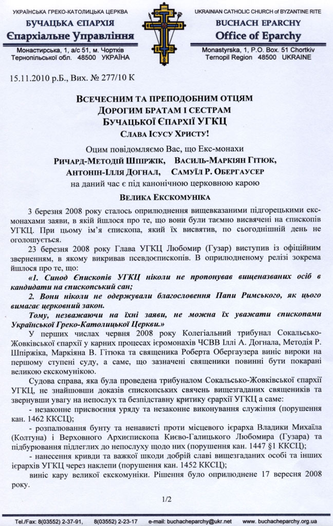 Колишні монахи Підгорецького монастиря на Львівщині Методій Шпіржік, Маркіян Гітюк, Ілля Догнал та Самуїл Обегаузер покарані Великою екскомунікою, тобто виключені з Католицької Церкви. Таке рішення Папський трибунал «Апостольська Сигнатура» прийняв ще в жовтні 2008 року. Про це 15 листопада 2010 року написав о. Дмитро Григорак, Апостольський адміністратор Бучацької єпархії у повідомленні до священиків та вірян єпархії.