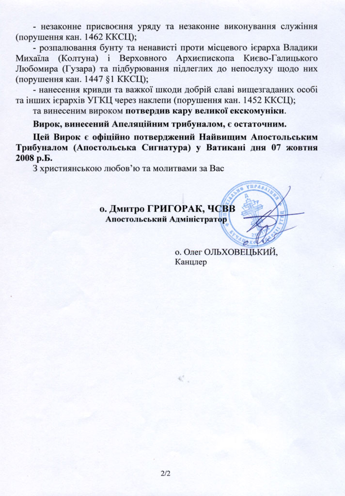 Ще в березні 2008 року Глава УГКЦ Блаженніший Любомир (Гузар) офіційно повідомив, що «Синод Єпископів УГКЦ ніколи не пропонував вищеназваних осіб в кандидати на єпископський сан». Водночас, «Папа Римський ніколи не благословив згаданих монахів на єпископів». Кардинал Гузар також підкреслив, що «незважаючи на їхні заяви, їх не можна вважати єпископами Української Греко-Католицької Церкви» .